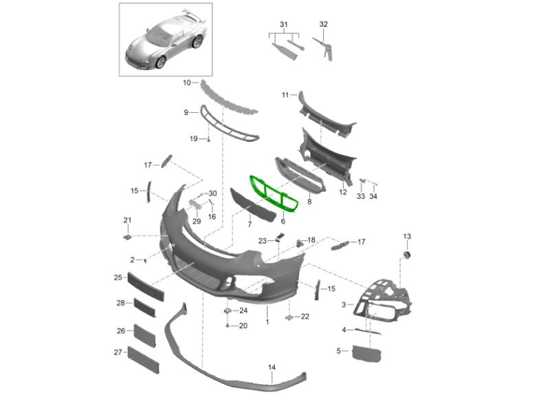 Il telaio di supporto centrale per paraurti anteriore, nero, è un componente di supporto e montaggio originale Porsche, progettato per la sezione centrale del paraurti anteriore sui modelli compatibili, più comunemente la Porsche 911 (generazione 991). Questo telaio di supporto svolge un ruolo strutturale fondamentale, mantenendo saldamente in posizione corretta le modanature centrali del paraurti, le sezioni della griglia e i relativi componenti di montaggio.