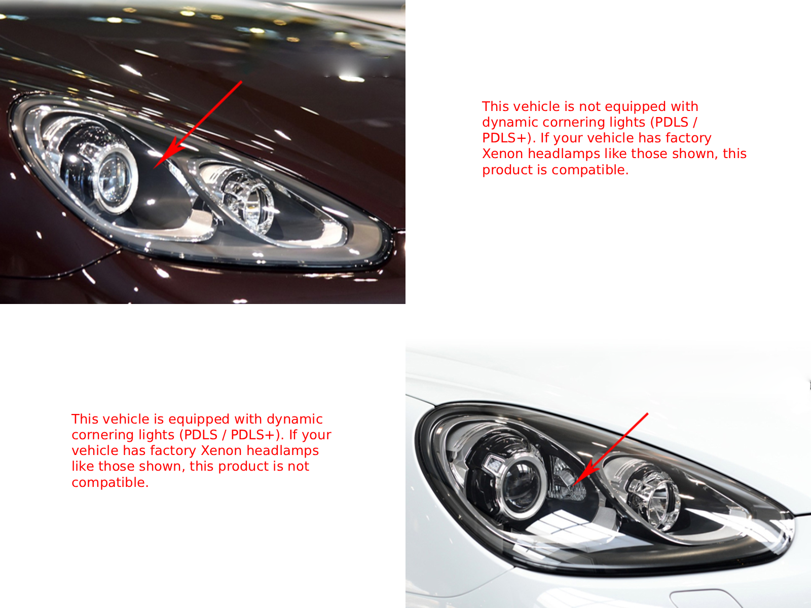 Questi fari sono plug-and-play per veicoli dotati di fari allo xeno con o senza Porsche Dynamic Lighting System (PDLS) - codici optional 8BC, 8BZ, 8BE, 8JE, 8EE, 8EF, 8EC, 8ED, 8JG, 8JJ.