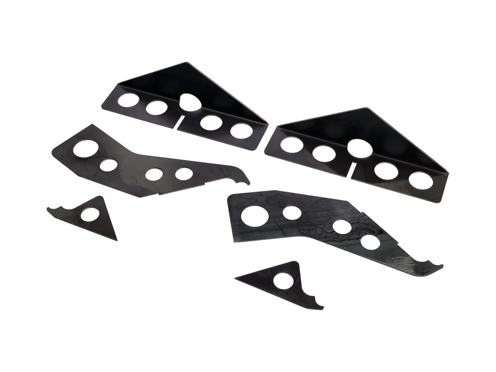 I pannelli di rinforzo per il montaggio della piastra della molla posteriore Elephant Racing sono pannelli tagliati e formati con precisione al laser in acciaio calibro 18. Questi pannelli distribuiscono i carichi della barra di torsione e della piastra della molla nell'alloggiamento del tubo di torsione e nella lamiera multistrato appena oltre le posizioni originali dei perni di montaggio.