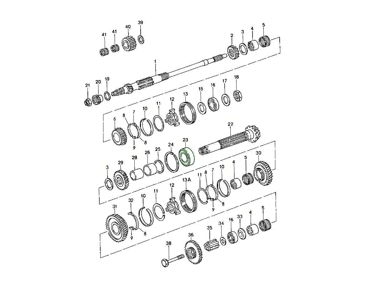 Un cuscinetto a rulli cilindrici utilizzato all'interno del cambio per supportare gli alberi rotanti (spesso l'albero principale o l'albero del pignone, a seconda dell'applicazione) consentendo loro di gestire carichi radiali significativi senza eccessivo attrito o usura.