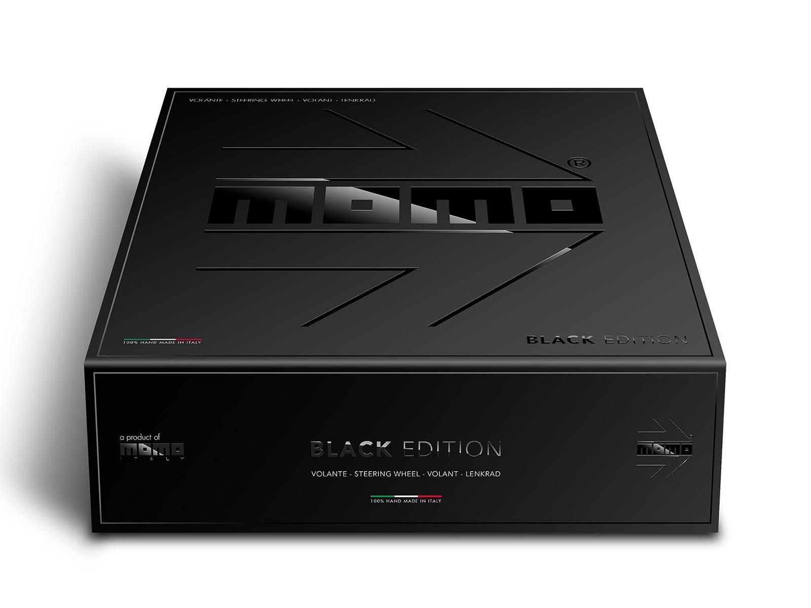 Prodotto con la migliore pelle nera italiana di prima qualità e presenta raggi in alluminio ritagliati neri con un logo "Anniversario" dorato inciso sul raggio destro e logo "MOMO" dorato sul raggio inferiore.