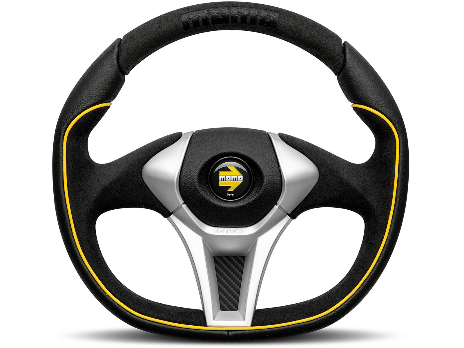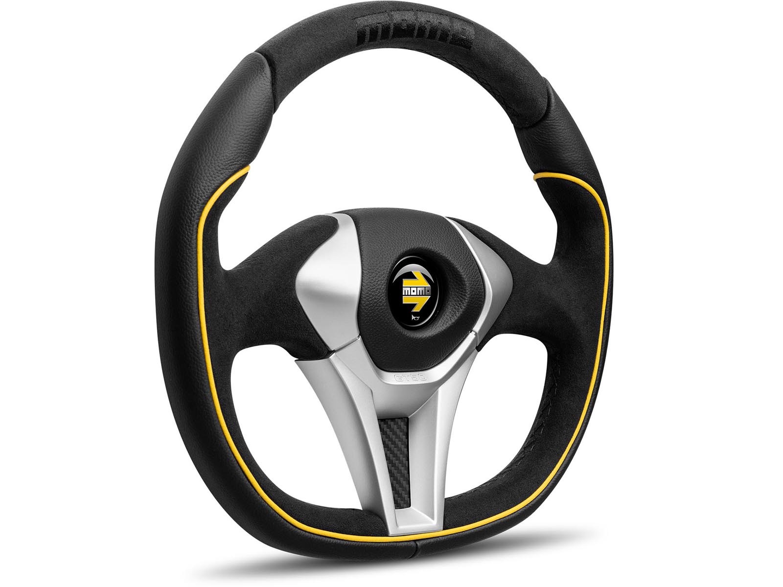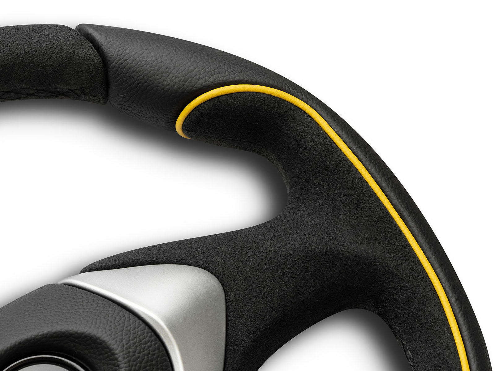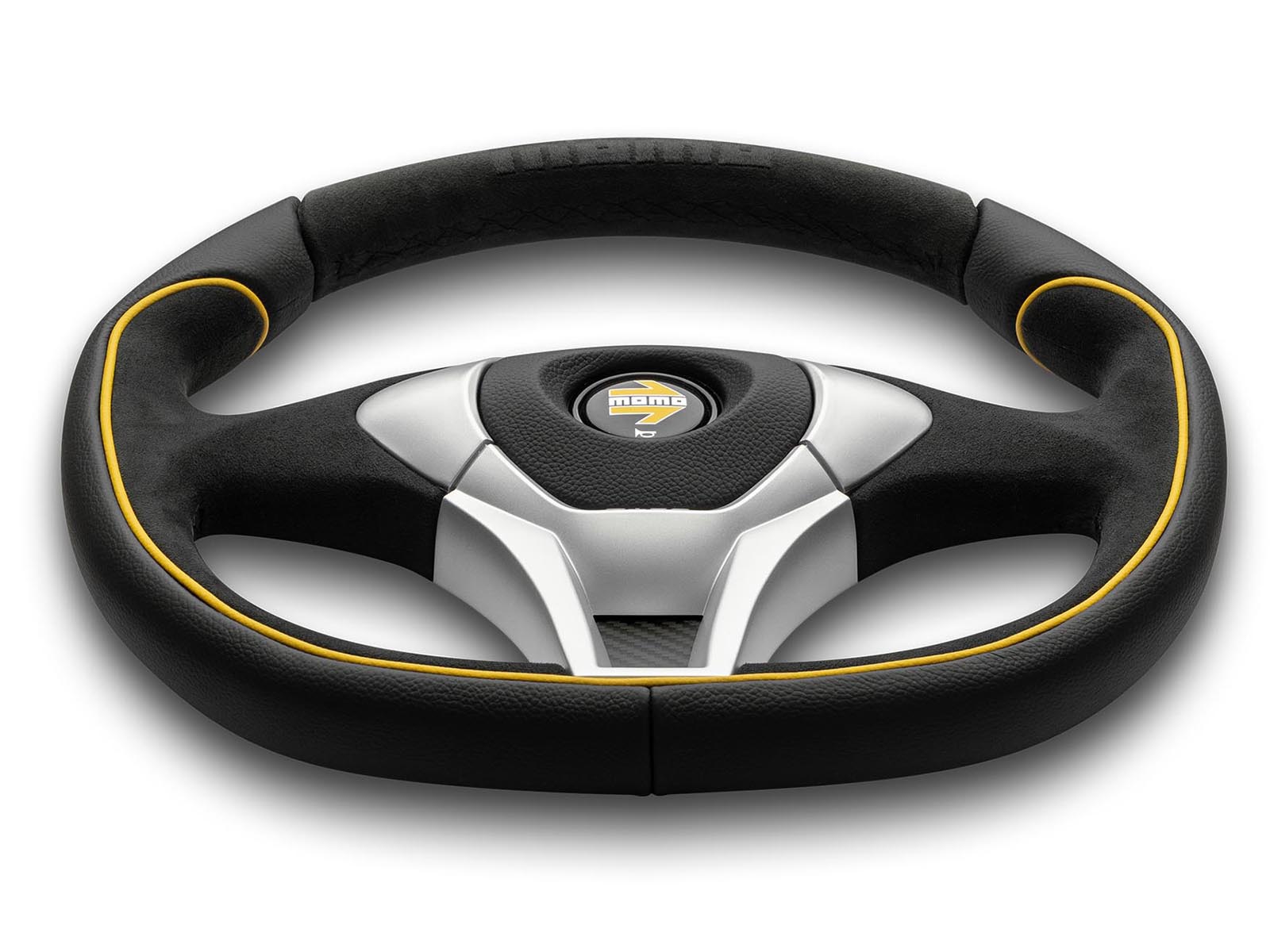 Il volante MOMO Drifting è dotato di razze ritagliate color antracite con logo MOMO giallo in rilievo a contrasto e pulsante del clacson MOMO Arrow nero lucido, giallo e cromato.