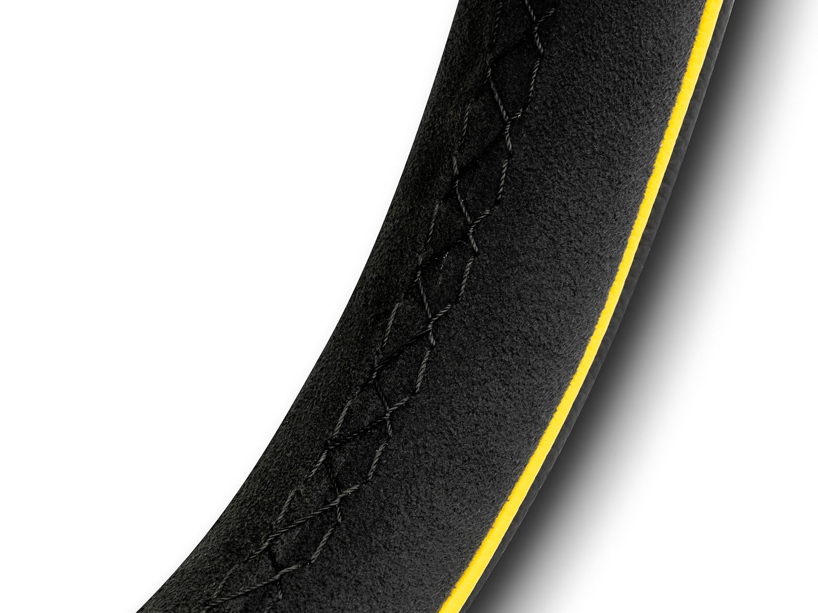 • Impugnatura dalla forma anatomica, realizzata in pelle e microfibra nera, impreziosita da un inserto in pelle gialla distintivo.