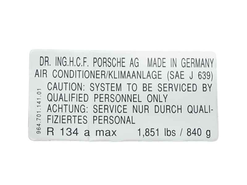 Riproduzione di alta qualità dell'adesivo informativo sul refrigerante dell'aria condizionata, progettato per i modelli Porsche 964 e Porsche 993 destinati al mercato statunitense.