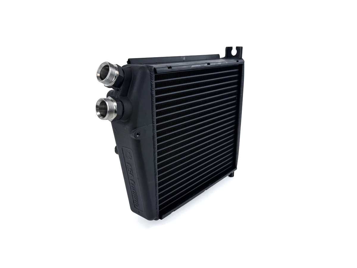 Omdat de bodemplaat van de koeler ook een veelvoorkomend probleemgebied is, heeft CSF geprobeerd dit gebied zoveel mogelijk te verbeteren. In plaats van het originele gegoten ontwerp maakt de CSF-koeler gebruik van een CNC-gefreesde aluminium plaat. Dit biedt een perfect vlak montageoppervlak dat zowel sterker is als beter bestand tegen kromtrekken na verloop van tijd. Je zult ook het speciale helixontwerp opmerken dat de stevigheid vergroot en tegelijkertijd het gewicht minimaliseert.