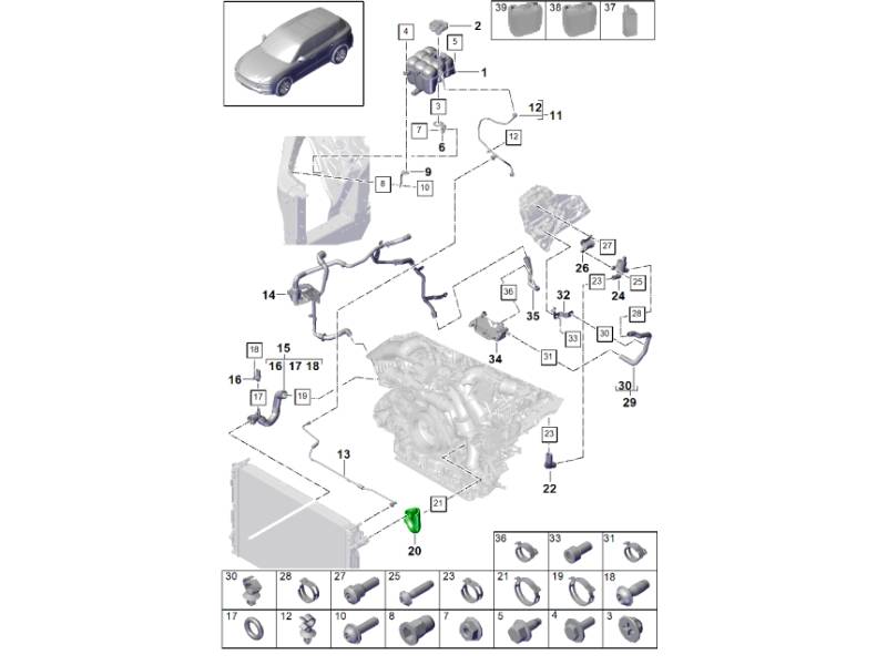 This kit is a complete centre-cooling system service solution designed specifically for the Porsche Cayenne 958 3.0 L Hybrid from 2015 onwards. It combines an OE Match centre radiator with OE Match and genuine coolant hoses and genuine Porsche mounting hardware - giving you a direct-fit, coordinated replacement group engineered for reliable, long-term cooling performance.