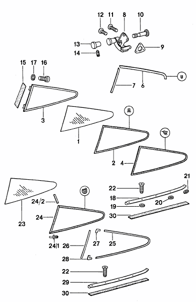 • Functie: De handgrepen zorgen voor soepel en veilig openen en sluiten van de achterste zijruiten, terwijl de basispakkingen het scharniergebied afdichten tegen vocht en de lak beschermen. Samen zorgen ze voor een correcte uitlijning, afdichting en bedieningsgemak van uw ventilatieramen.