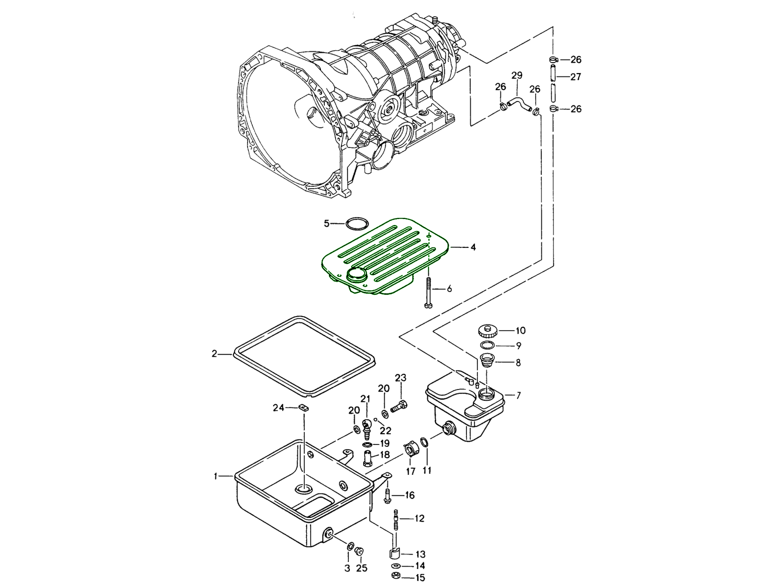 Originele vervangende oliefilter voor de Tiptronic automatische transmissie van de Porsche 968. Deze oliefilter bevindt zich in het carter van de Tiptronic transmissie en filtert verontreinigingen uit de automatische transmissievloeistof voordat deze door de versnellingsbak circuleert. Het zorgt voor een correcte vloeistofaanvoer naar de hydraulische componenten en blijft compatibel met het originele carter, de pakking en de afdichtingen. Het is een essentieel onderdeel voor routinematig verversen van de automatische transmissievloeistof of onderhoud aan de versnellingsbak.