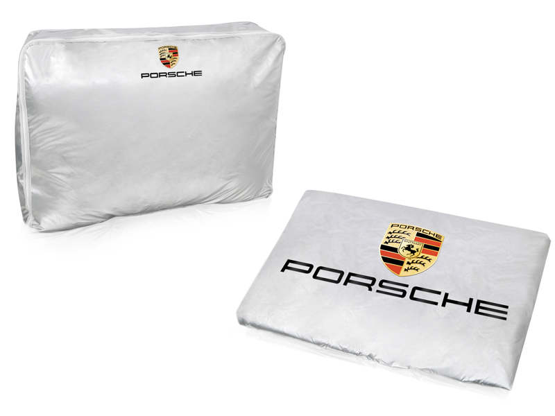 Outdoor autohoes in zilver met gekleurd Porsche embleem en logo.
