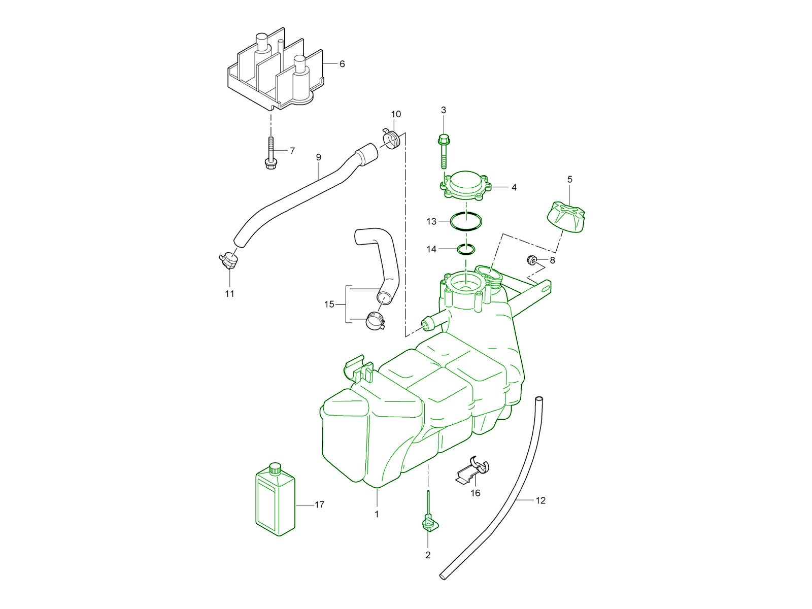 Genuine Porsche cooling system kit provides the genuine coolant expansion tank, correct sealing cap, and long-life antifreeze concentrate - everything needed to refresh and maintain your vehicle’s coolant reservoir system the way Porsche intended.