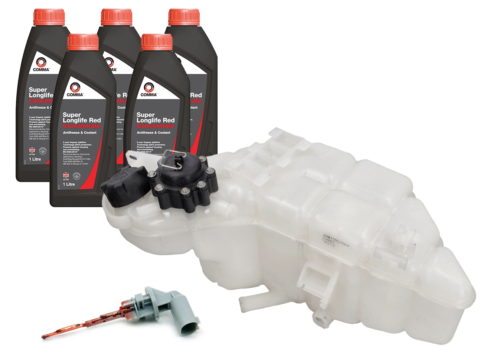 This kit includes a direct-fit coolant expansion tank, pressure cap, long-life red antifreeze, and a coolant level sensor, giving you the essential components needed to refresh the coolant reservoir side of the engine cooling system with parts that match the original equipment specifications.