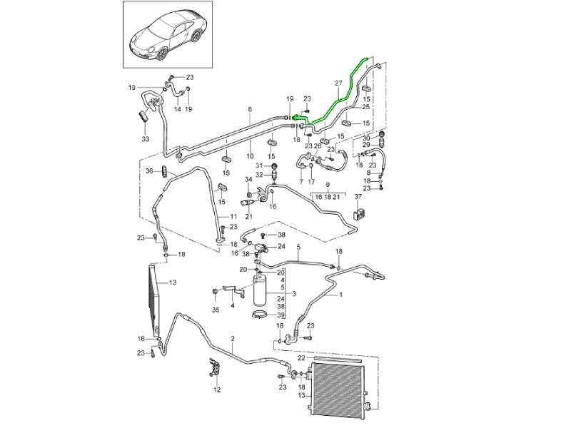 Aircoleidingen vormen het verbindingsnetwerk tussen de belangrijkste componenten van het airconditioningsysteem van uw Porsche. Ze zorgen voor efficiënte koelmiddelcirculatie, drukregeling en warmte-uitwisseling in het hele systeem.