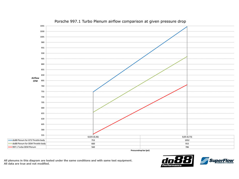 Met dit extreem hoge debiet Plenum zullen de prestaties van uw 997 generatie 1 toenemen! - De resultaten van het uiteindelijke ontwerp waren zeer indrukwekkend, aangezien de do88 Plenum de Porsche OEM Plenum totaal overtrof met 34% meer debiet bij gebruik in combinatie met een GT3 82 mm gasklephuis bij dezelfde drukval!