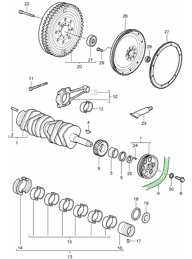 - Belangrijke motoronderdelen , zoals de nokkenas, dynamo en waterpomp.