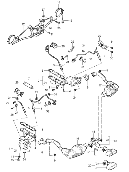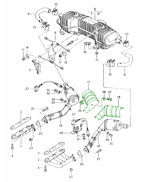 De katalysator speelt een cruciale rol in het uitlaatsysteem van uw Porsche. Hij vermindert schadelijke emissies en zorgt voor een optimale uitlaatgasstroom. De katalysator, die tussen het uitlaatspruitstuk en de uitlaatdemper is geplaatst, zet giftige gassen zoals koolmonoxide, koolwaterstoffen en stikstofoxiden om in minder schadelijke emissies voordat ze de uitlaat verlaten.