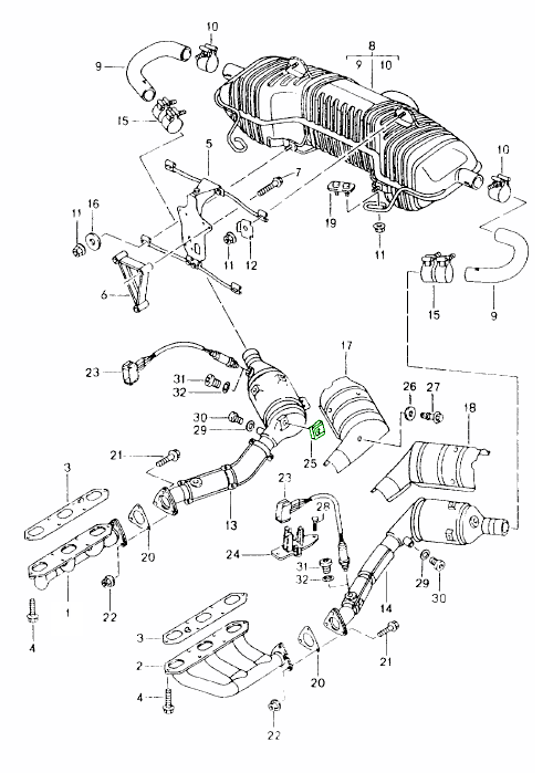 De katalysator speelt een cruciale rol in het uitlaatsysteem van uw Porsche. Hij vermindert schadelijke emissies en zorgt voor een optimale uitlaatgasstroom. De katalysator, die tussen het uitlaatspruitstuk en de uitlaatdemper is geplaatst, zet giftige gassen zoals koolmonoxide, koolwaterstoffen en stikstofoxiden om in minder schadelijke emissies voordat ze de uitlaat verlaten.