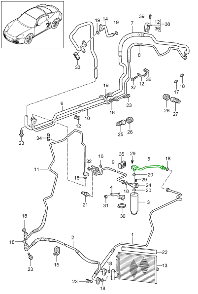 Aircoleidingen vormen het verbindingsnetwerk tussen de belangrijkste componenten van het airconditioningsysteem van uw Porsche. Ze zorgen voor efficiënte koelmiddelcirculatie, drukregeling en warmte-uitwisseling in het hele systeem.
