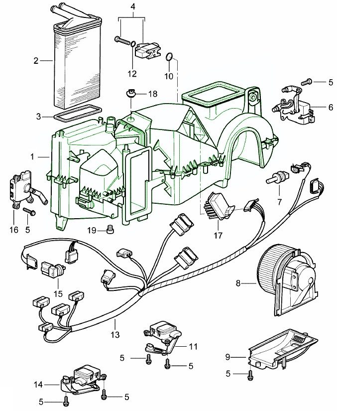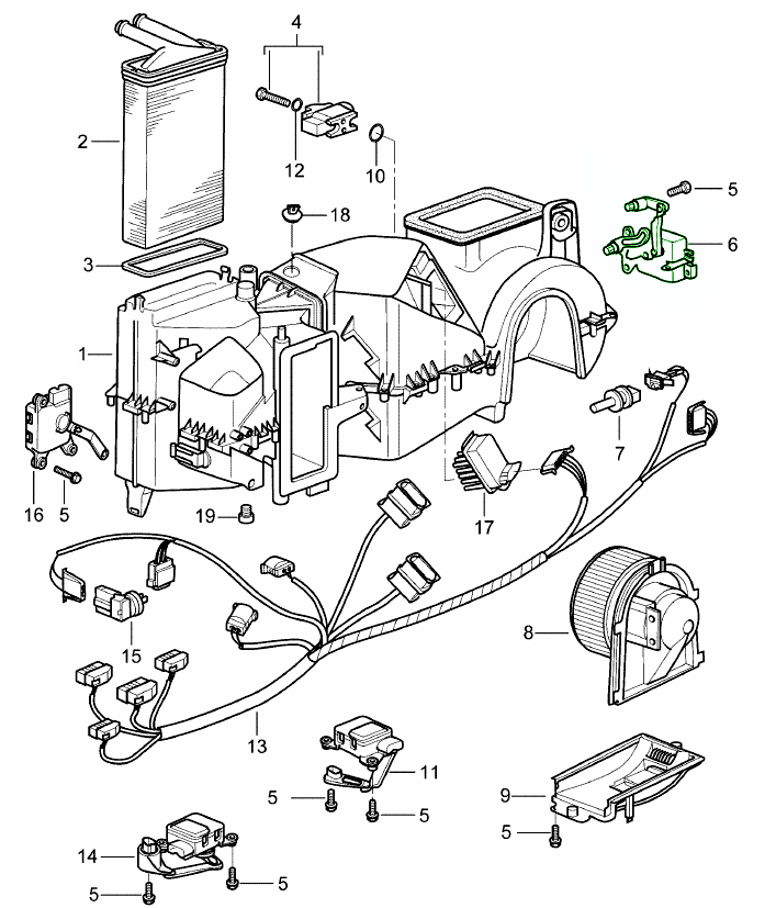 De verwarmings- en airconditioningbehuizing vormt de kernstructuur die de luchtstroom door het HVAC-systeem van uw Porsche geleidt en vasthoudt. Het huisvest essentiële componenten zoals de ventilatormotor, verdamper, verwarmingsradiator en kleppen – die zorgen voor een goede verdeling van warme en koele lucht door het interieur. Een goed afgedichte, correct uitgelijnde behuizing zorgt voor een efficiënte, evenwichtige luchtstroom en een constant comfort in de cabine.