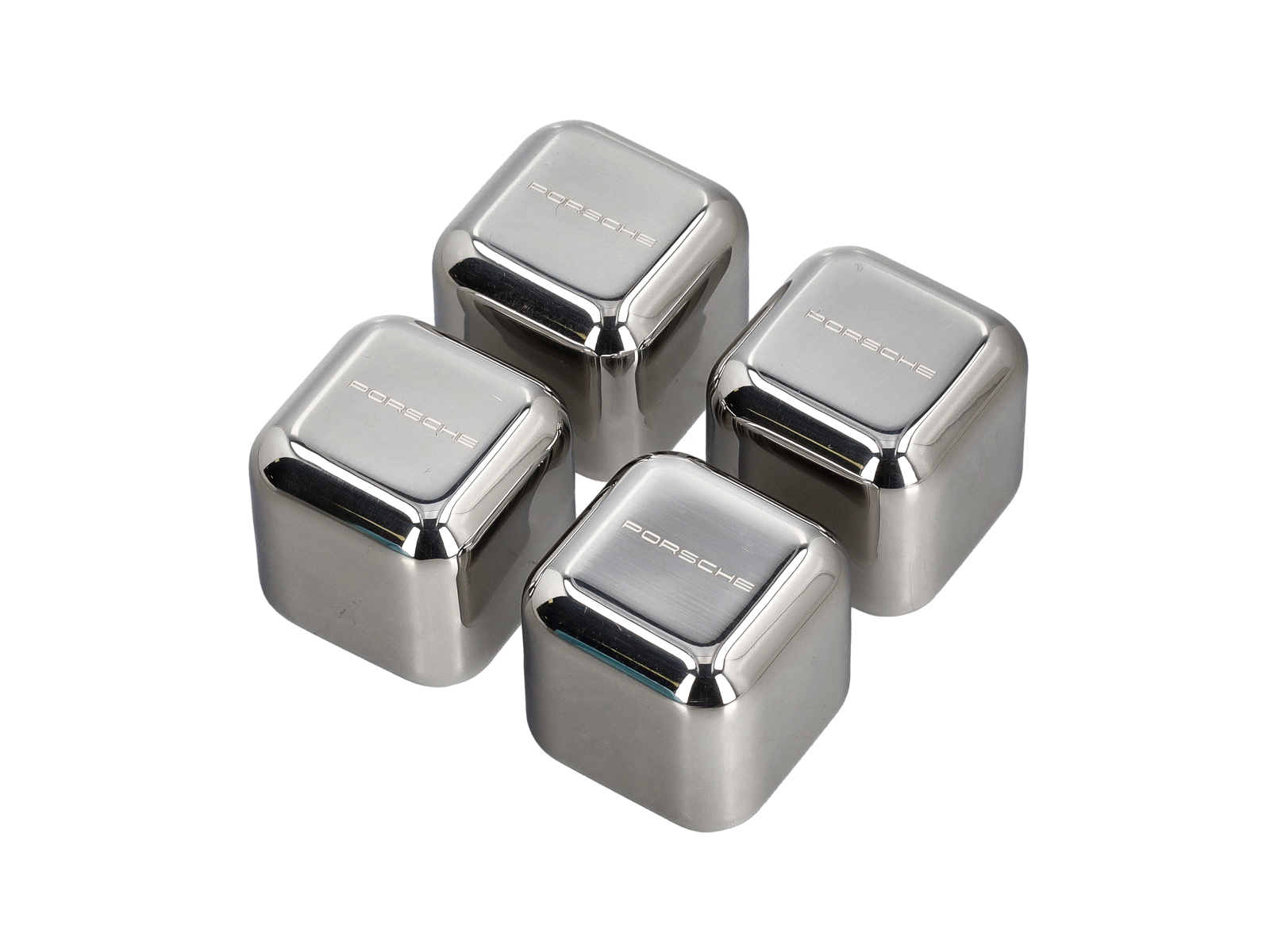 Vier Porsche-ijsblokjes van roestvrij staal met lasergegraveerd Porsche-opschrift – smaakneutraal, langdurig koud, herbruikbaar.