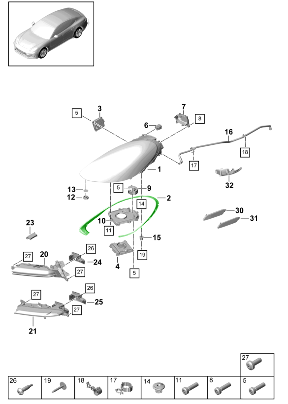 Zonder werkende koplamponderdelen kunnen het zicht, de veiligheid en het design van uw Porsche in gevaar komen.