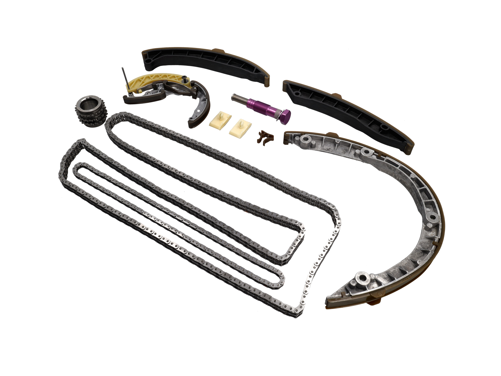 Complete vervangingsset voor de distributieketting. Deze set bevat de hoofdaandrijfketting, de oliepompaandrijfketting, tandwielen/tandwielen, kettinggeleiders en spanonderdelen die nodig zijn om de krukas en nokkenassen te synchroniseren, voor een nauwkeurige kleptiming en pompwerking.