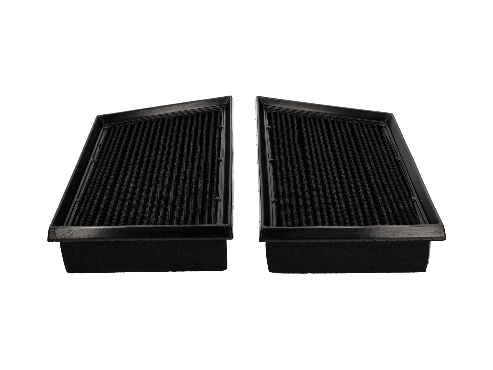 Deze filters worden doorgaans per twee geleverd voor voertuigen met dubbele inlaatelementen op het 992-platform. Ze bieden volledige bescherming van de inlaat en zorgen voor een evenwichtige luchtstroom aan beide zijden van het inlaatsysteem van de motor.