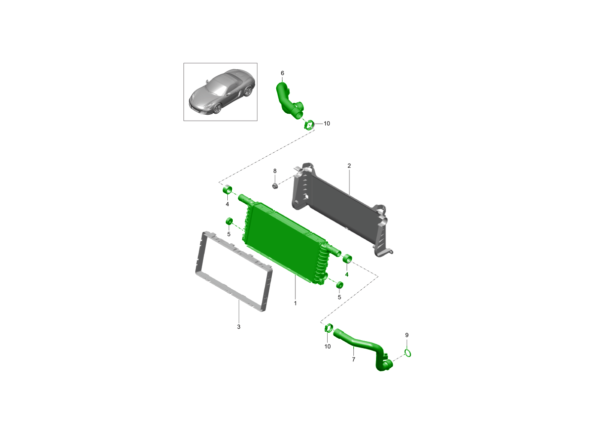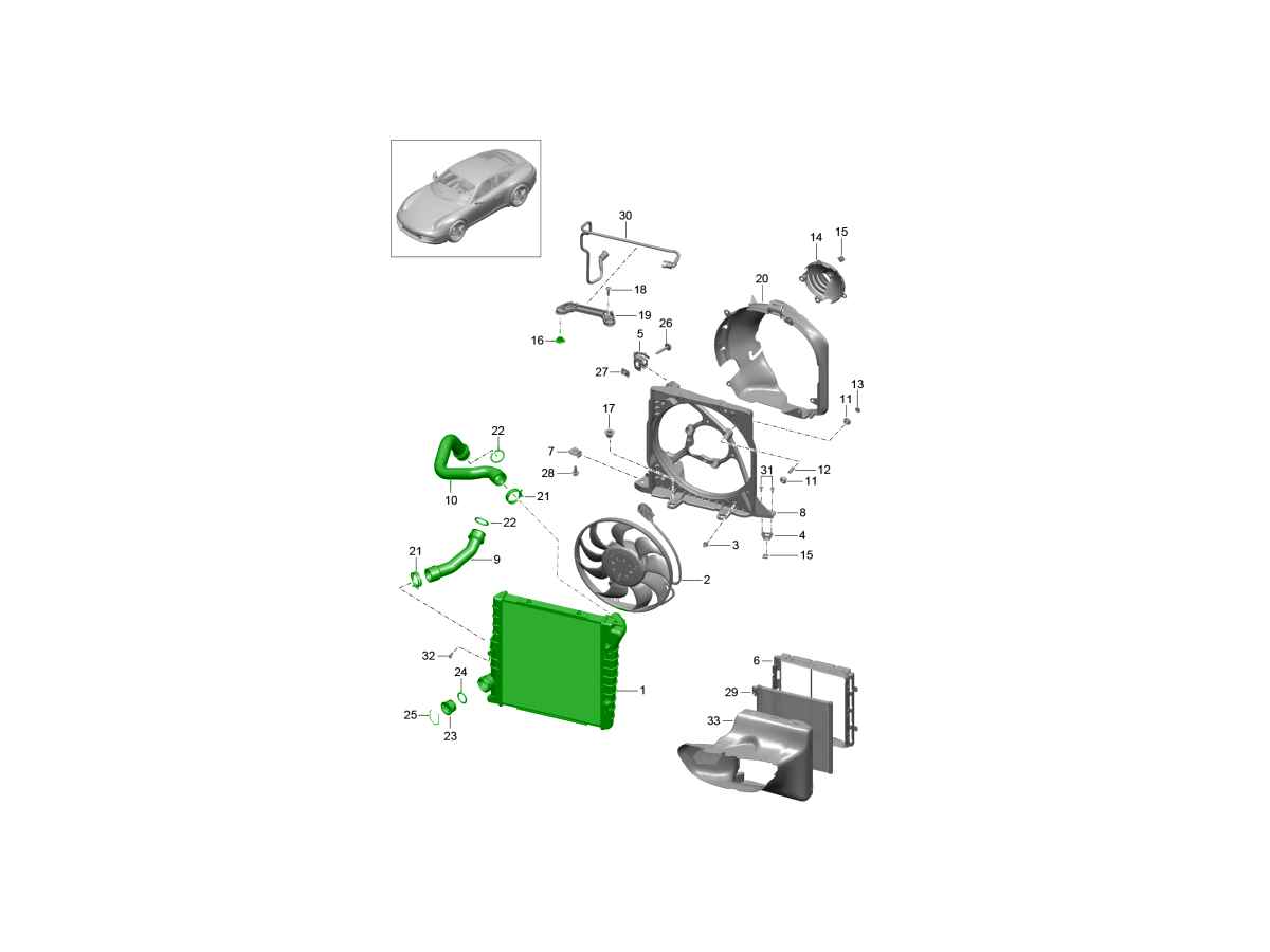 The Porsche 981 cooling system relies on three front-mounted radiators to dissipate heat from the engine coolant. These radiators maintain stable engine operating temperatures by transferring heat away from the coolant through airflow across the radiator core.
