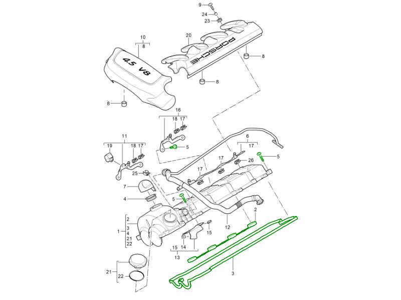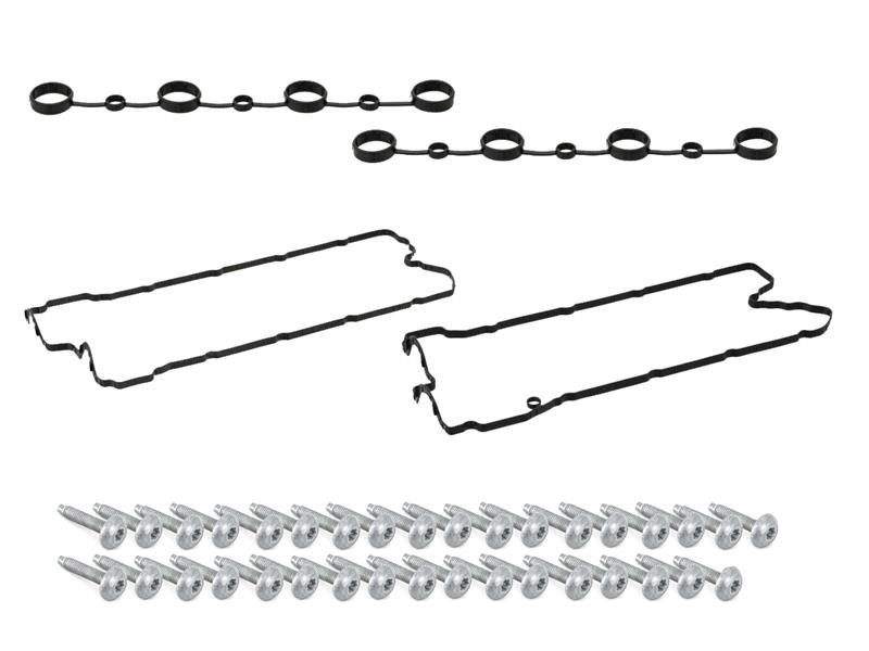 This OE MATCH set of valve cover gaskets and bolts is designed to maintain a secure oil seal between the cylinder head, valve cover, and spark plug tube openings. These components are commonly used on Porsche Cayenne 4.5 L V8 engines and help prevent engine oil leaks around the valve cover and spark plug wells.