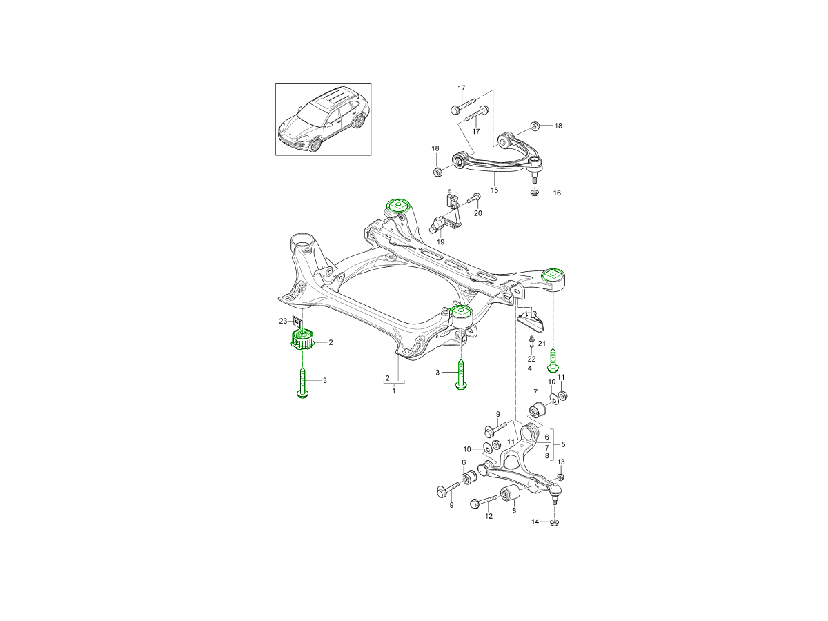 This complete front subframe mount and bolt kit is designed specifically for Porsche 955, 957 and 958 Cayenne models.