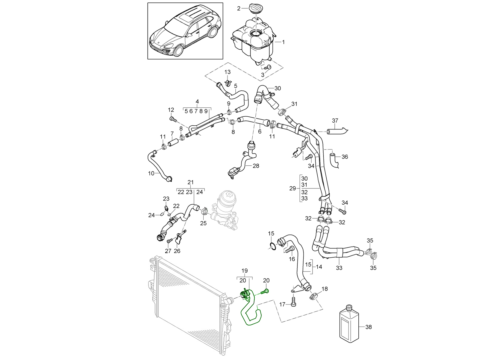 The Porsche Genuine OE Upper Radiator Coolant Hose 95810640140 is a vital cooling-system component for the Porsche Cayenne 3.0 L Diesel (958), ensuring proper flow of coolant into the radiator. Its Porsche-specified design, fit, and materials help preserve engine thermal stability, support reliable performance, and maintain correct factory coolant routing.
