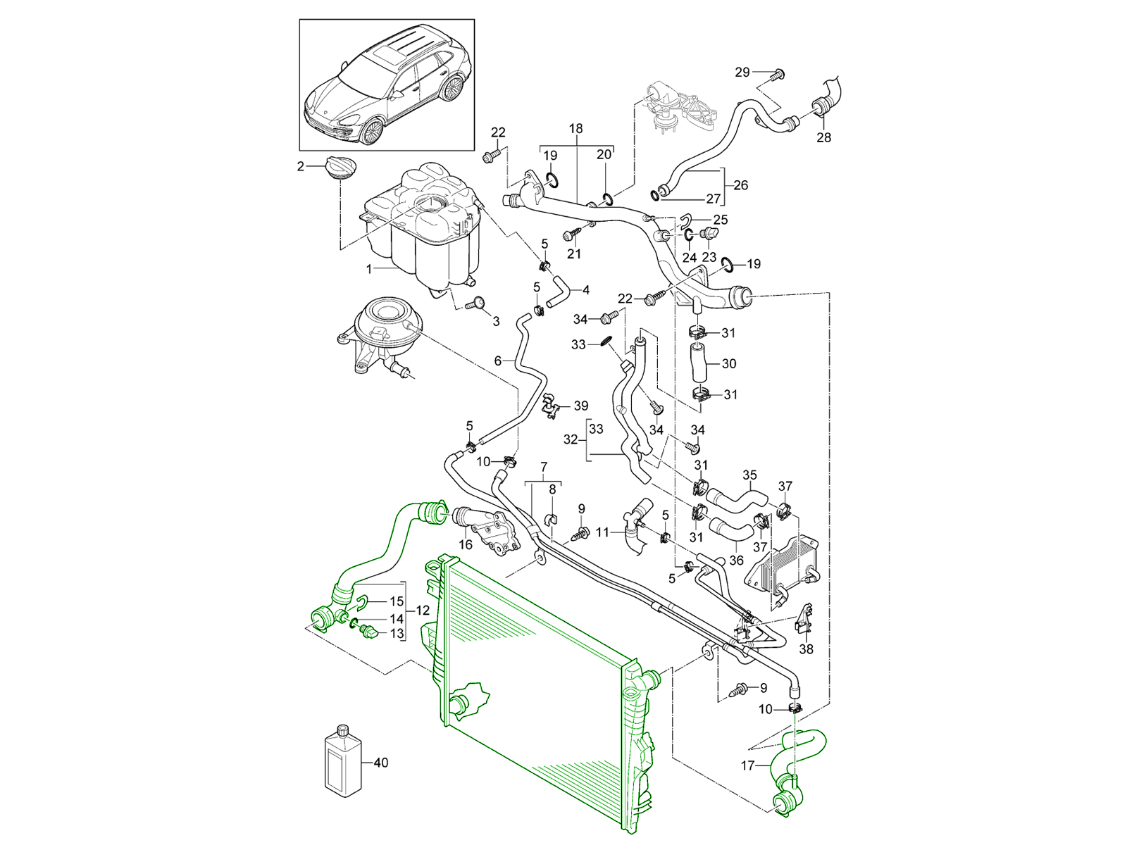 Radiator water with hoses, Centre.This kit is a complete centre-cooling system service solution designed specifically for the Porsche Cayenne 958 3.0 L Hybrid from 2015 onwards. It combines an OE Match centre radiator with OE Match and genuine coolant hoses and genuine Porsche mounting hardware - giving you a direct-fit, coordinated replacement group engineered for reliable, long-term cooling performance.