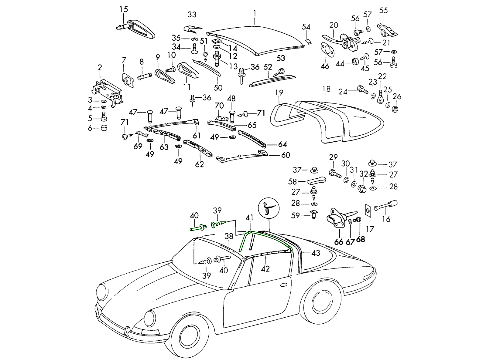 Classic Porsche 911 Targa models use a removable roof panel that locks into the windshield frame at the front and seals against the Targa roll bar at the rear. The rear roll bar seal provides the rubber interface between the roof panel and the roll bar structure.