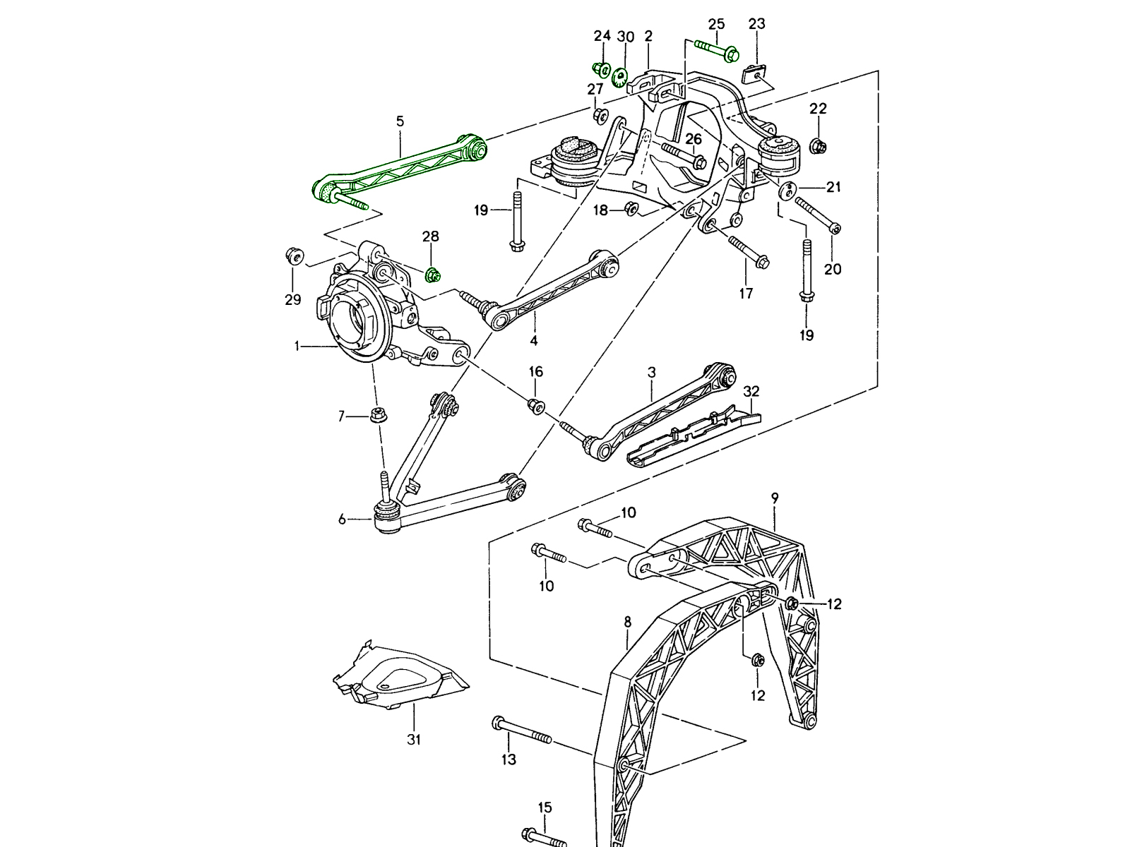 The rear upper control arm (often referred to as the rear forward suspension link) is a key component of the multi-link rear suspension used in Porsche 993 models. It links the rear wheel carrier to the chassis and allows controlled suspension movement while maintaining accurate wheel geometry.