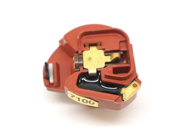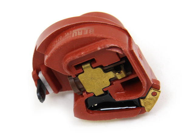 The rotor is constructed such that the center tab is electrically connected to its outer edge so that voltage coming in to the center post travels through the carbon point to the outer edge of the rotor. As the camshaft rotates, the rotor spins and its outer edge passes each of the internal plug terminals to fire each spark plug.