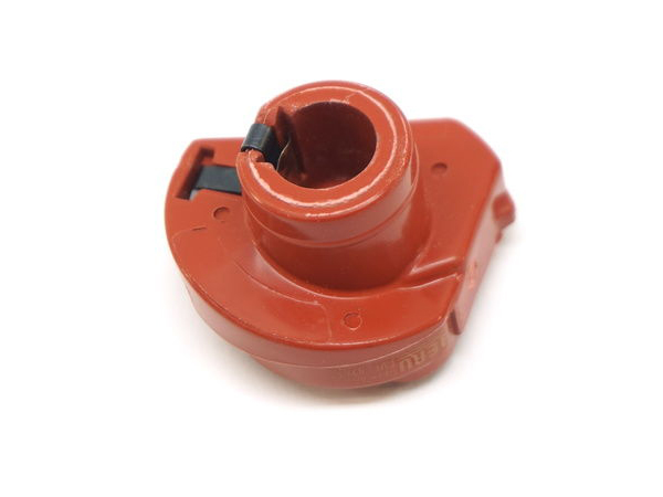 The "rotor" head is attached to the top of the distributor shaft which is driven by a gear on the engine's camshaft and thus synchronized to it. This rotor is pressed against a carbon brush on the centre terminal of the distributor cap which connects to the ignition coil either through the top and wired directly to the coil in HEI systems, or via the centre terminal in points ignition systems and remotely connected to the coil.