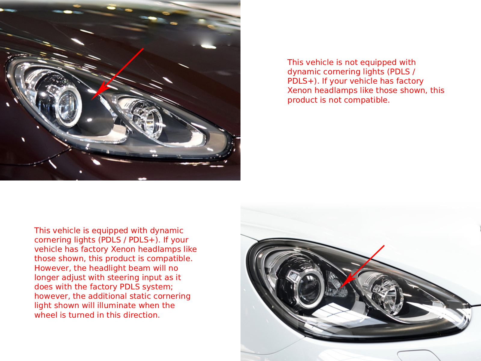 These headlamps are plug-and-play for left-hand drive vehicles equipped with Xenon headlamps and Porsche Dynamic Lighting System (PDLS) - option codes 8BE, 8JE, 8EE, 8EF.