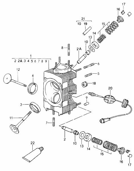 • The valve stem goes through the valve guide in the head, and the head of the valve seals against the exhaust seat when closed, with its tip actuated by the rocker or cam mechanism.