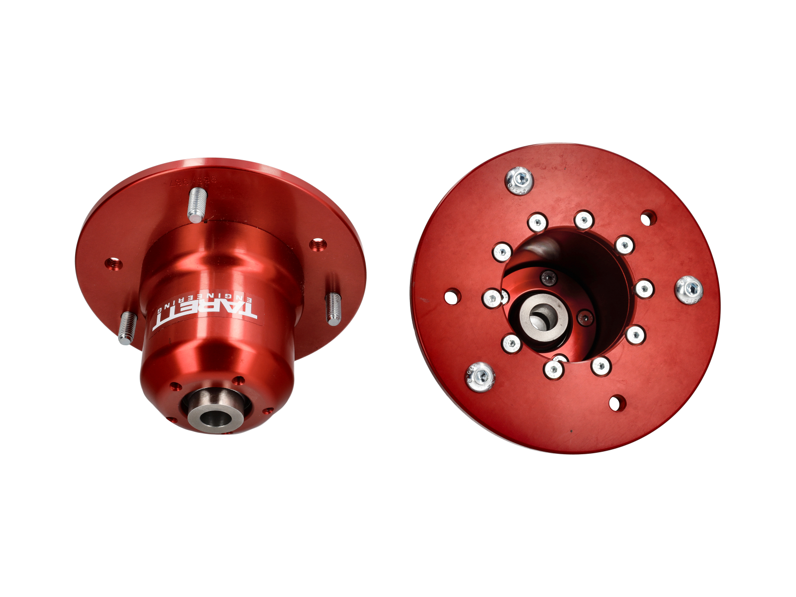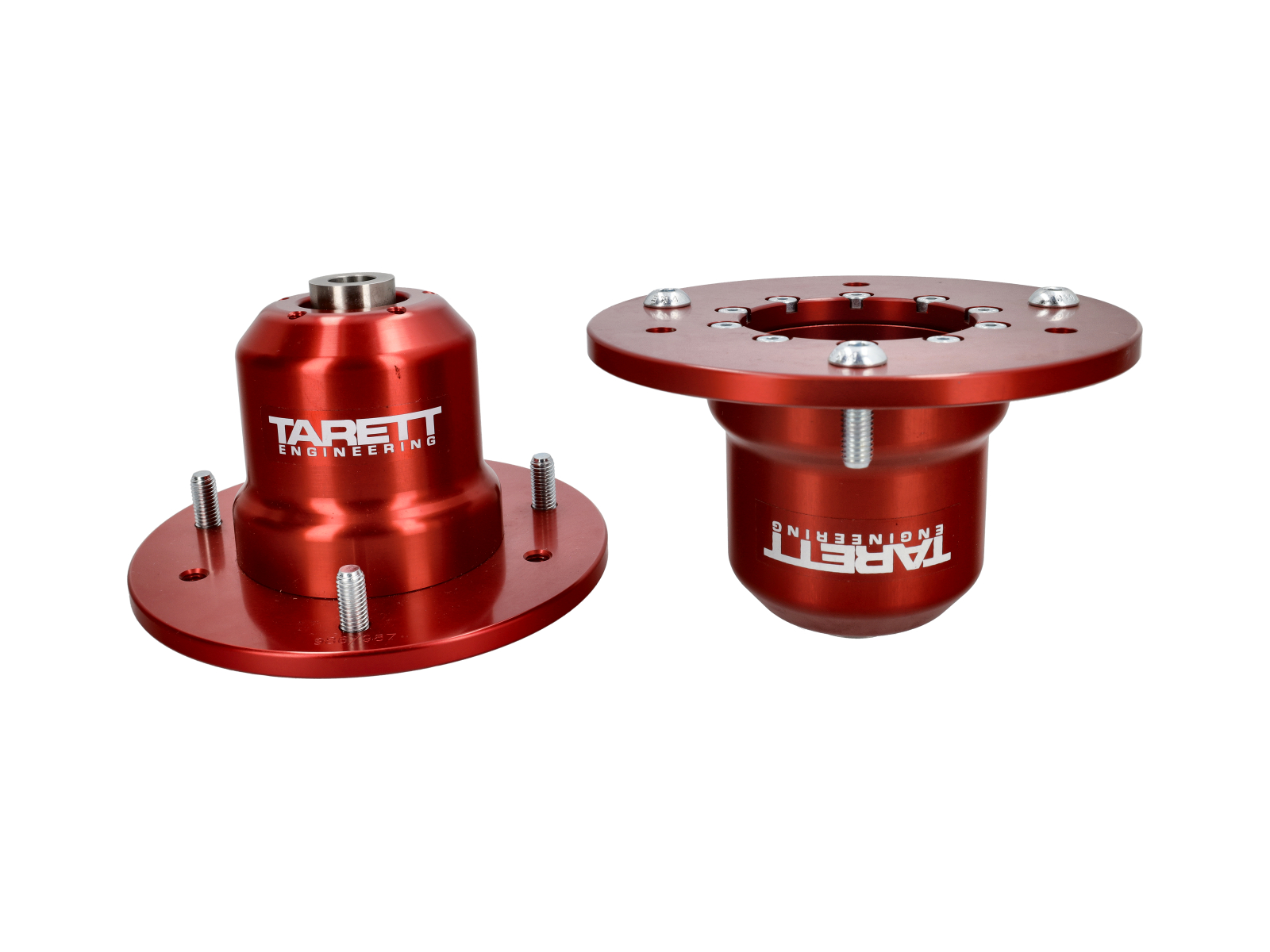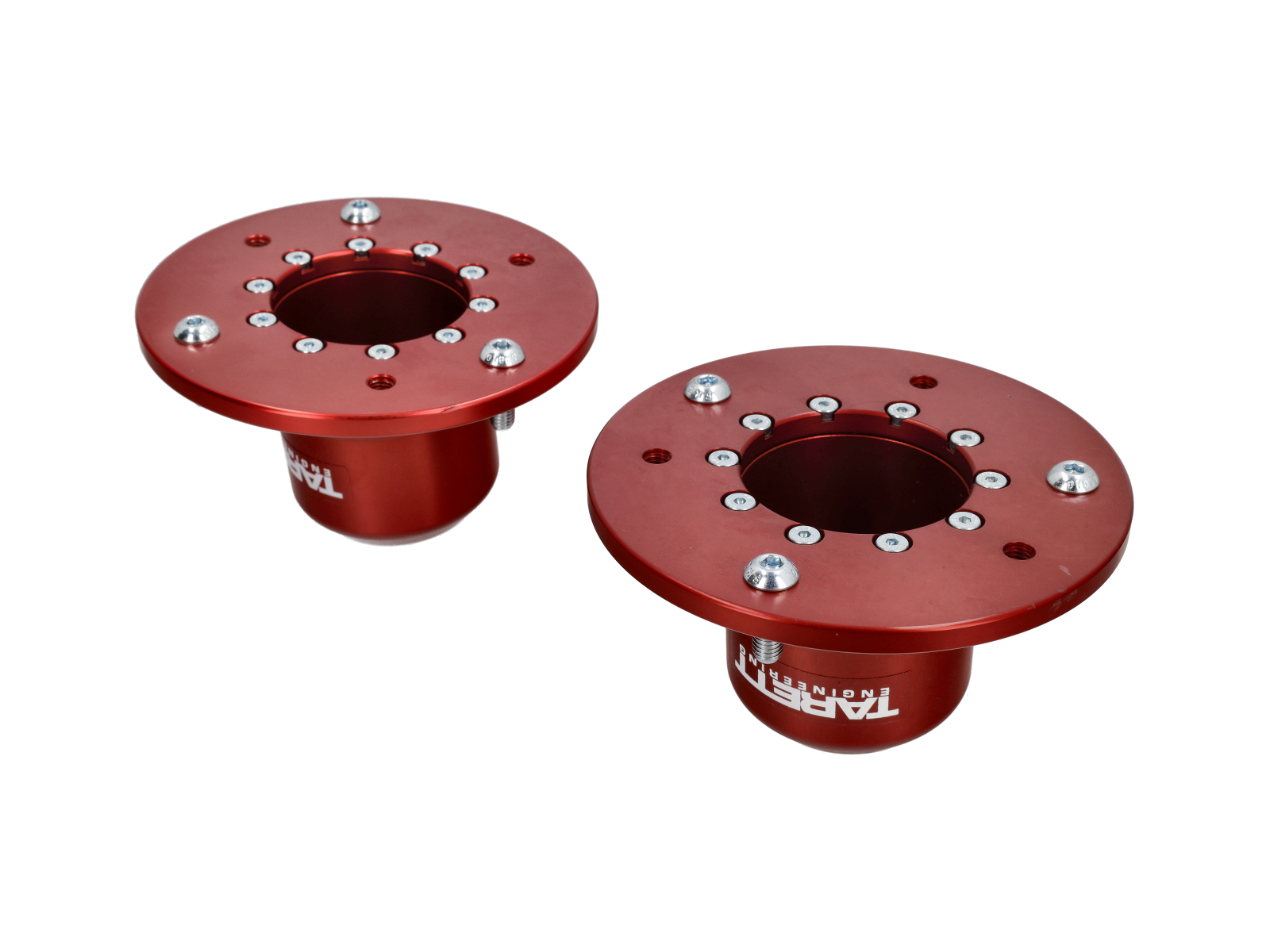The compliant factory rubber bushing is replaced with a precision Teflon-lined spherical bearing for increased suspension rigidity, quicker steering response, and better handling. The spherical bearing is made to our specific specifications, and will not wear out and rattle like others on the market. The housing is CNC machined from 6061-T6 aluminum billet, providing high-strength, light weight, and a perfect match to the factory mounting surface. The spherical bearing is securely clamped into the billet housing. Other designs use a small retainer ring to trap the bearing in a bore, which could cause annoying rattling and possible failure. The spring load is distributed on the housing, not the monoball, for increased monoball life. These are the only upper mounts on the market that are fully compatible with all factory and aftermarket style upper spring seats.