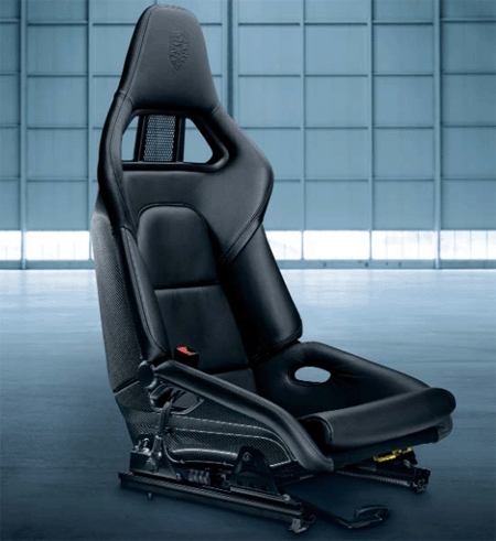 With folding backrest, integrated thorax airbag and manual fore/aft adjustment. The backrest shell is made from plastic reinforced with glass fibre and carbon fibre, with a stylish carbon-weave finish. The folding backrest enables easy access to the rear luggage area. Available in black leather with embossed Porsche Crest on the headrest, or in black flame-resistant material.