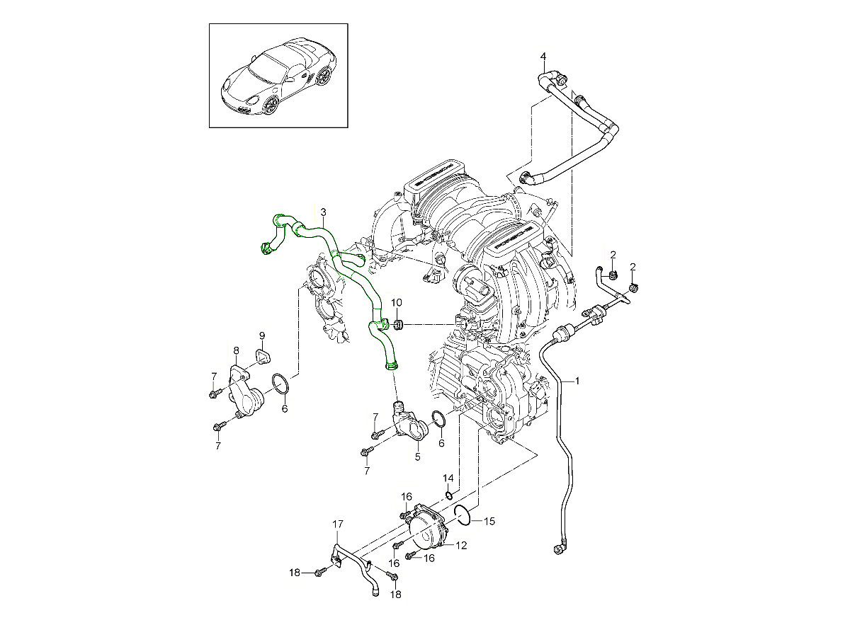 Crankcase breather hose.The 9A110751501 crankcase breather hose is a factory-specified part of the air/oil separation and PCV ventilation system used on water-cooled Porsche flat-6 engines fitted to Boxster and Cayman models. It connects the engine crankcase to the air/oil separator (AOS) or ventilation circuit, allowing crankcase gases to vent safely while directing blow-by vapours through the appropriate filtration pathway.