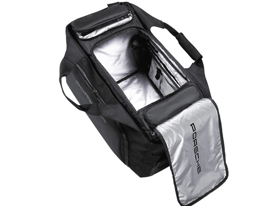 Porsche Sports Bag.With room for all your kit, just add competitive spirit. Spacious main compartment with double zip. Separate, ventilated compartment for laundry. Detachable, adjustable shoulder strap with non-slip padding. Water-repellent outer zips. Made of durable poly
