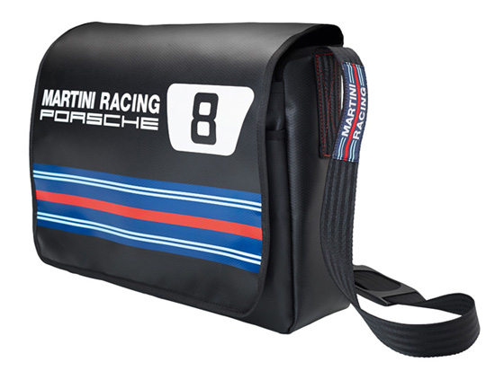 Porsche Shoulder bag – MARTINI RACING CollectionRobust and waterproof shoulder bag made of canvas fabric with MARTINI RACING motif. Shoulder strap made of original seatbelt material. In black. Dimensions: 31 x 30 x 11 cm. Swiss made.