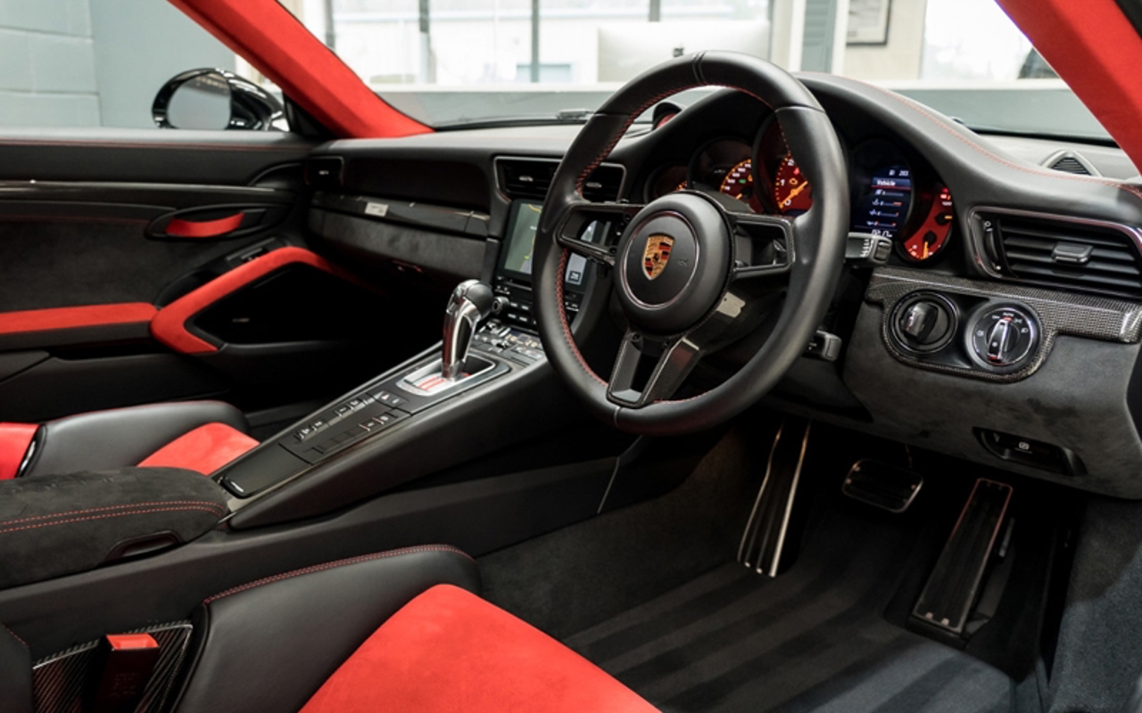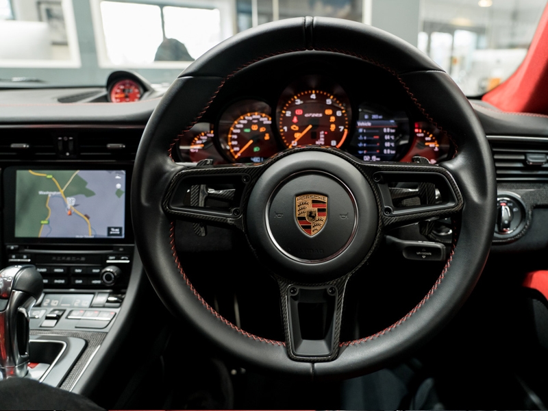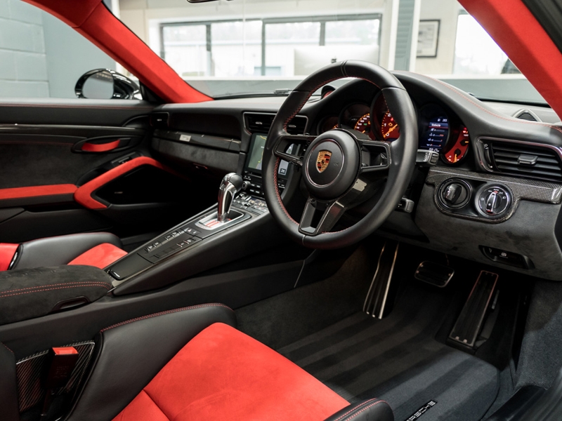 Inside, this example is finished in an exquisite arrangement of Guards’ Red Alcantara & Black Leather with the instrument dials & chrono stopwatch in Guard’s Red too. It is a simply stunning cabin. This car is fitted with the all-important clubsport pack which means the car gets the 918 Carbon Fibre Bucket Seats and with the additional Weissach Pack, the roll cage is upgraded to a titanium one. Refinery, comfort & a raucous race car edge join together to make this one of the finest cabins on a GT2RS we have ever seen.  It’s typically Porsche, and its typically brilliant.