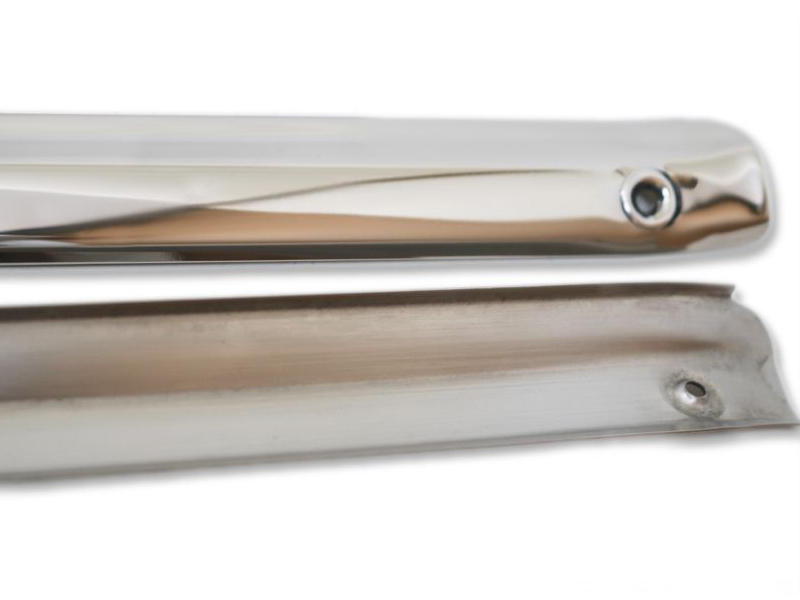 This door sill cover set includes two polished stainless-steel plates, designed to replace the original factory sill trims on the left and right sides of the door threshold.