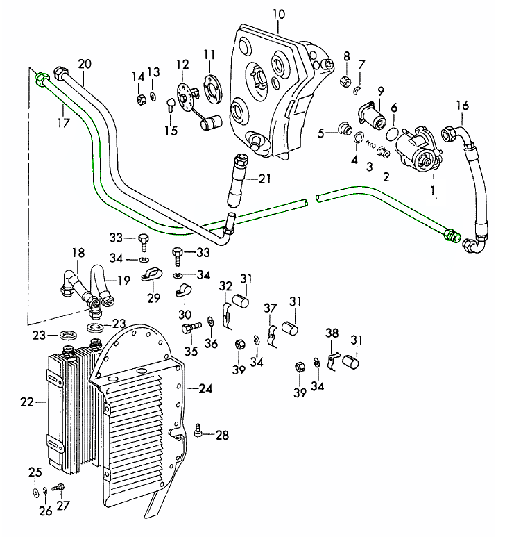 oil between the engine, oil cooler, and filter housing.