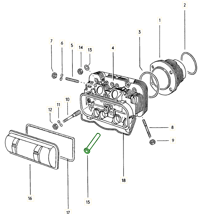 This is the standard valve guide used in early air-cooled Porsche 911/930 cylinder heads. It’s a plain (non-hydraulic) guide that locates the valve stem in the head; when worn it causes oil burning, loss of compression and poor valve seating — so they’re commonly replaced whenever heads are rebuilt.
