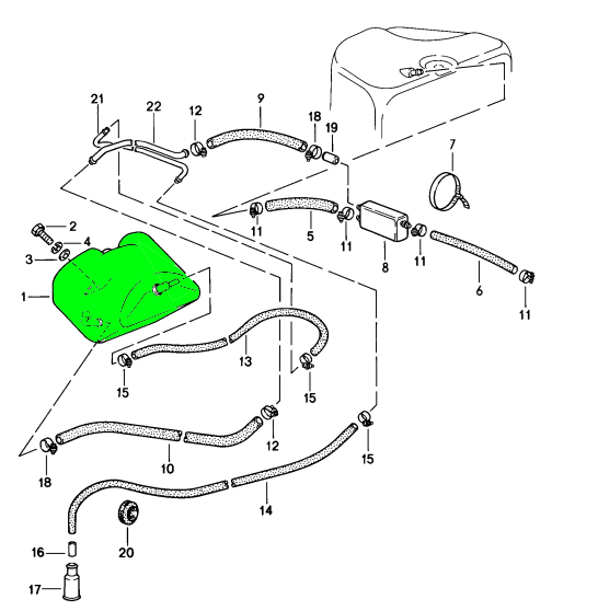 The expansion tank acts as a safety and performance component within the fuel system. It collects and stores excess vapour and liquid fuel when tank pressure increases, preventing evaporation losses and maintaining correct fuel delivery pressure.