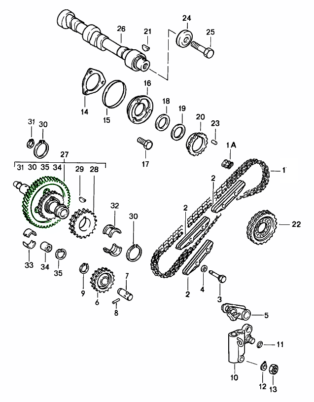 • Function: Transmits rotational motion from the timing chain to cam drive or auxiliary systems, helping to maintain engine valve timing integrity.