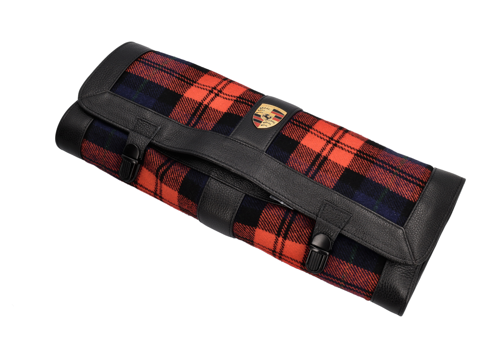 Porsche Classic has redesigned this tool bag, producing a new edition with a spectacular look in the style of the late 1970s. Whereas the original featured only artificial leather, the new tool bag is made of real black leather and red tartan fabric. The design of the fabric is based on a typical seat cover from this era. Following on from the development of a tool bag for the 911 F model, the range now includes a tool bag for the subsequent 911 models. These vehicles boast special features, such as the towing lug, which comes complete with brief instructions and is designed as a bayonet hook allowing it to attach to the original trailer, which was fitted with a simplex hook. All tools have specified slots in this new bag as well. The screwdriver handles are made of yellow plastic just as before, but now also feature Porsche lettering. To make handling easier, Porsche Classic has replaced the original spark plug tool with a ratchet that features a special spark plug socket wrench and is much more practical to operate.
