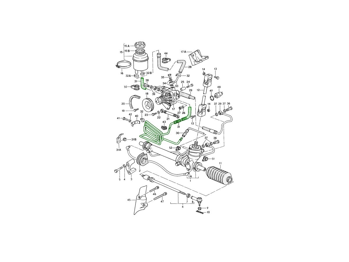 The power steering pressure line is a critical hydraulic component in the steering system of the Porsche 944 (left-hand drive models). This high-pressure hose delivers hydraulic fluid from the power steering pump to the steering rack, enabling smooth, controlled steering input and reducing driver effort.
